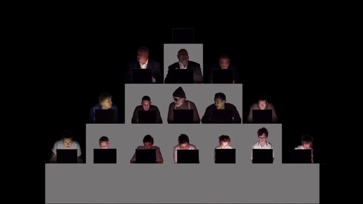 Срывмашина - пространство, в котором разворачивается действие спектакля. Сцена - это иерархическая пирамида системы управления, внутрь которой помещены агенты. Каждый уровень пирамиды соответствует уровню игры. Верхний порядок управляет нижним - все по правилам. Но игроки безвольны, их действия построены на примитивных стимулах и реакциях. Прилипнув к игре, они тычут в кнопки клавиатуры и пялятся в экран. Их подёргивания – пластика современных движений.